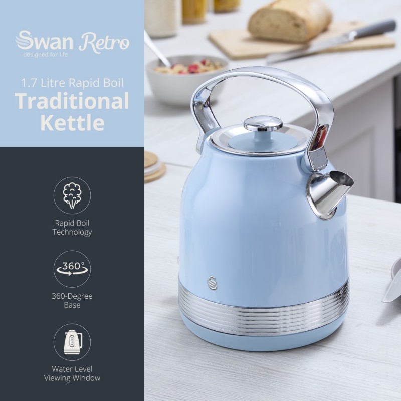This Swan Retro traditional electric kettle is designed in the style of an old fashioned stovetop kettle. Featuring a large 1.7 litre capacity, you can make up to seven cups from one boil, perfect for entertaining your loved ones. This stainless steel kettle features rapid boil technology, which boils water for one cup in just under 45 seconds. It also features a 360-degree rotating base for both left or right handed users to safely pick up and pour with ease. The spout has been specially designed to safely pour without spilling, while the removable limescale filter ensures your water tastes fresh for a delicious hot drink every time. You can monitor water levels through the indicator window, letting you see exactly how much water needs boiling for a certain number of cups with just a quick glance. Additional safety features include boil dry protection that stops the kettle boiling when there isn’t enough water and automatic switch-off. It also comes with cord storage to keep your kitchen worktop neat and tidy. Swan Retro is a refreshing twist on a stylish and timeless design. The glossy painted stainless steel with eye-catching chrome accents transforms your everyday essentials into a stylish kitchen centrepiece.