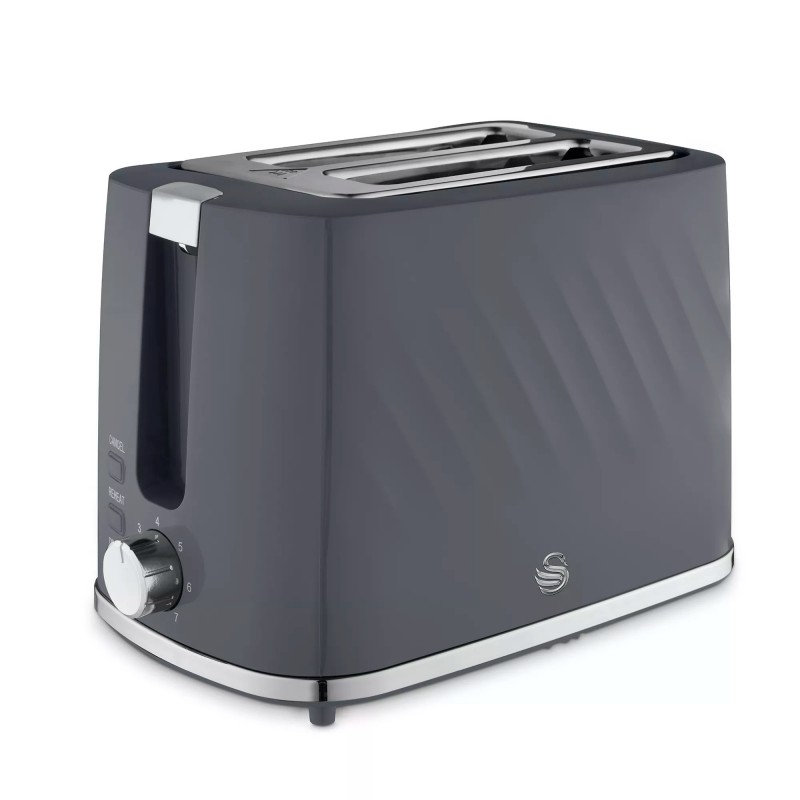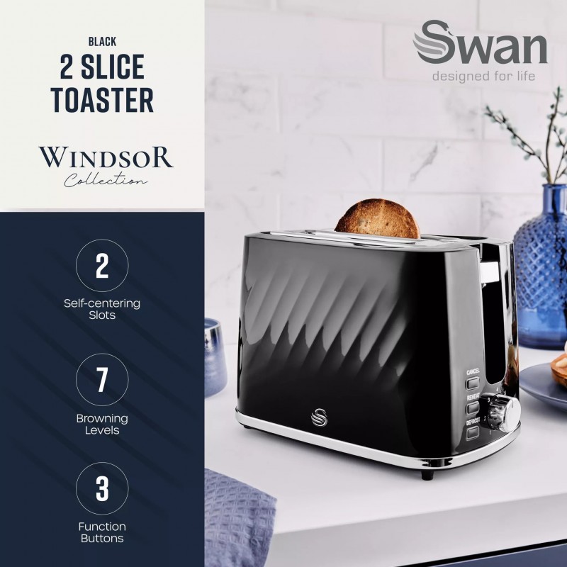 This 2-slice toaster from the brand new Swan Windsor collection features a textured gloss finish, complete with chrome accents to add subtle contemporary flair to your kitchen. The two large slots can fit different sized slices of bread, muffins, crumpets, and bagels, all perfectly toasted thanks to the seven different browning levels to choose from. It also features a handy defrost function, which lets you toast straight from frozen in minutes – helping you save money and avoid food waste. Been distracted with a task and now your toast has gone cold? Then the reheat function returns your food back to the optimal temperature without burning it, ready to eat again. This Swan toaster also has a removable crumb tray for easy cleaning and integrated cord storage to keep your worktop neat and tidy, while the anti-jam function prevents fire. The non-slip feet provide added stability. It’s the perfect addition to your kitchen collection.